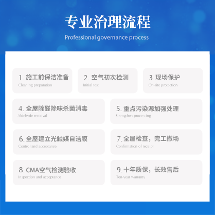 我們提供十年質保合同,如果十年內(nèi),客戶在不進行二次裝修或者添置新家具的情況下,原有的裝修及家具存在甲醛、苯、TVOC、氨超標的現(xiàn)象,我們將進行免費治理,提供客戶完善的售后保障。